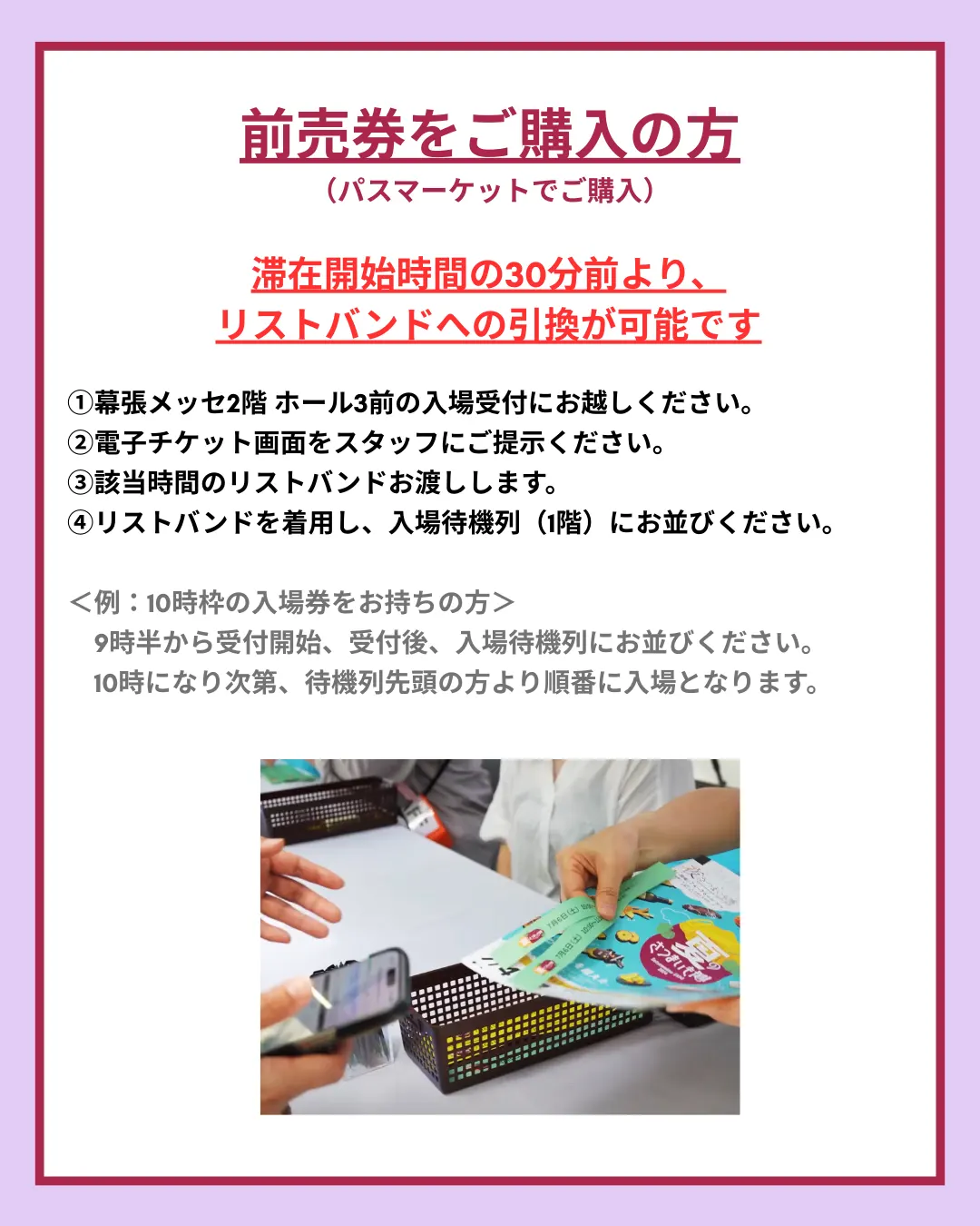 再入場受付(1F)で、ご着用のリストバンドと引き換えに、次回以降の時間枠のリストバンドをお渡しします。