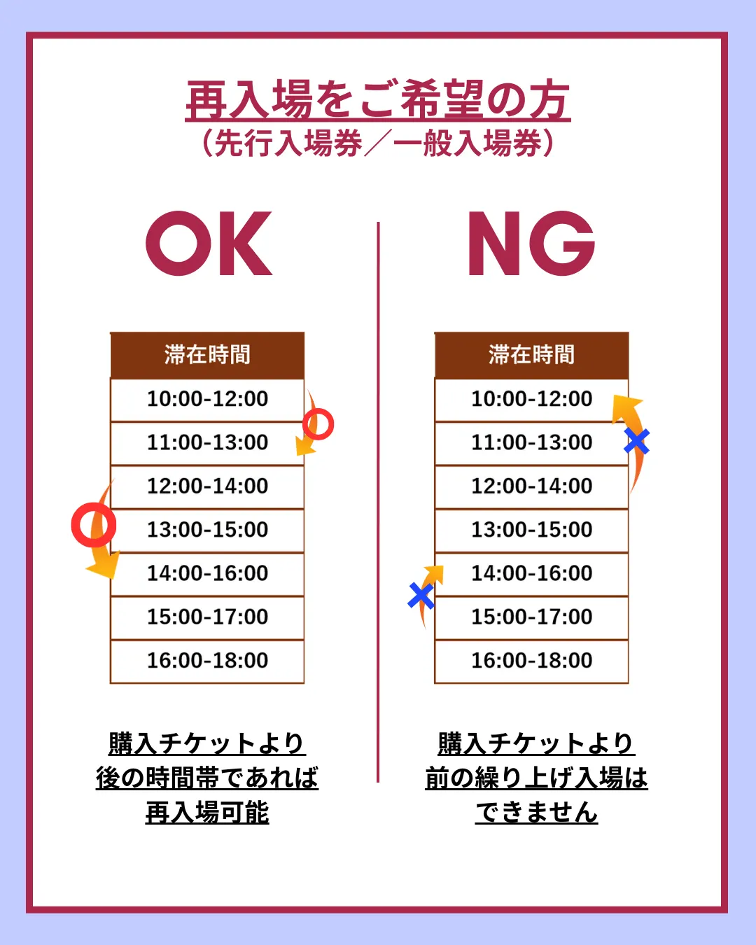 ご購入いただいた時間枠はもちろん出入り自由ですが、当日中に限り別の時間枠での再入場も可能です。