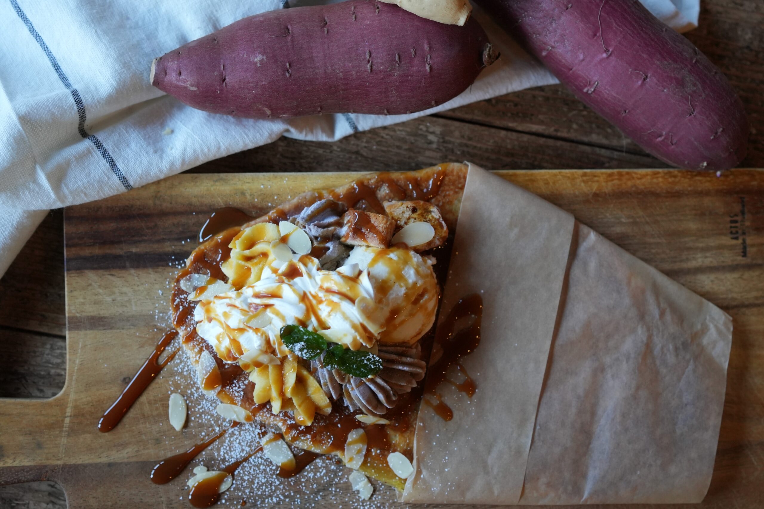 バターを染み込ませながら焼き上げたサクジュワ食感のバター生地に自家製スイートポテトで仕上げたお芋のプレミアムバターシュガークレープをぜひお召し上がり下さい。