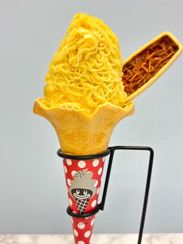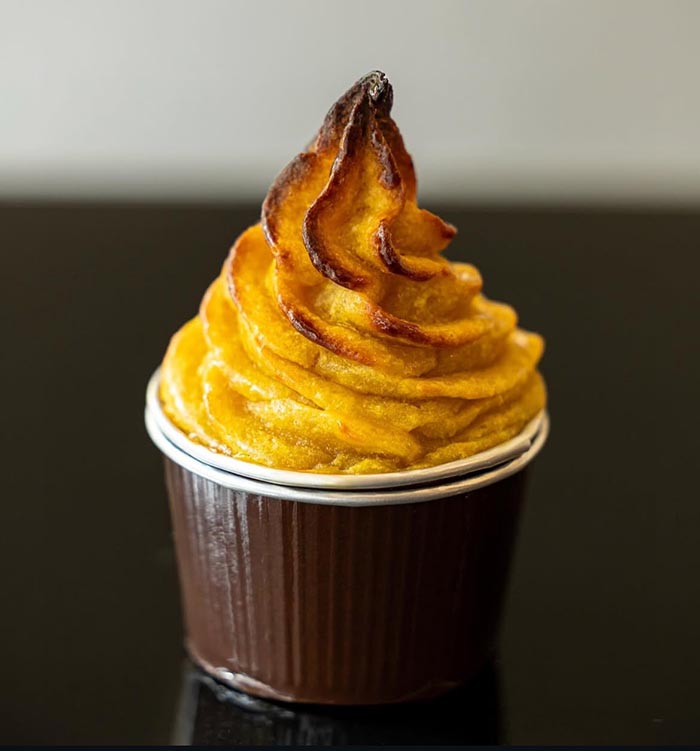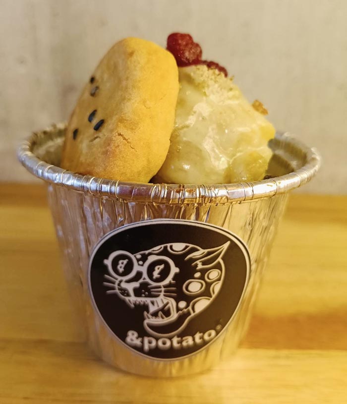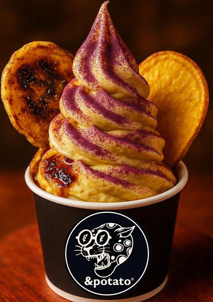 お芋のソフトクリームに、濃厚な焼き芋ペーストを1㎜に縛り、うなぎいもフロランタンと岩塩をトッピング