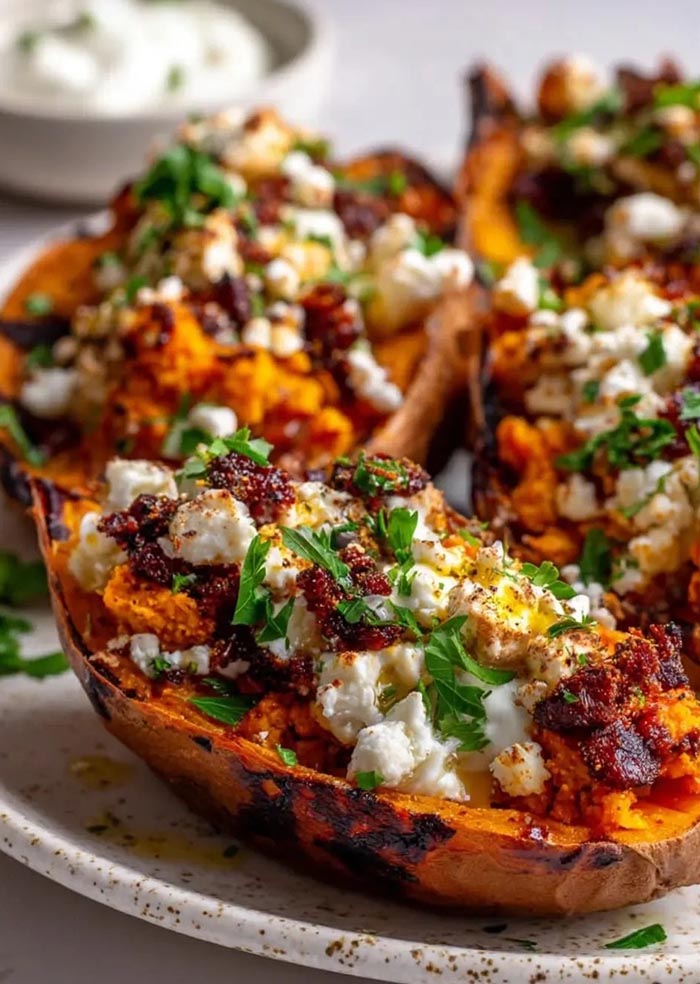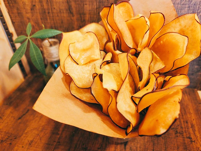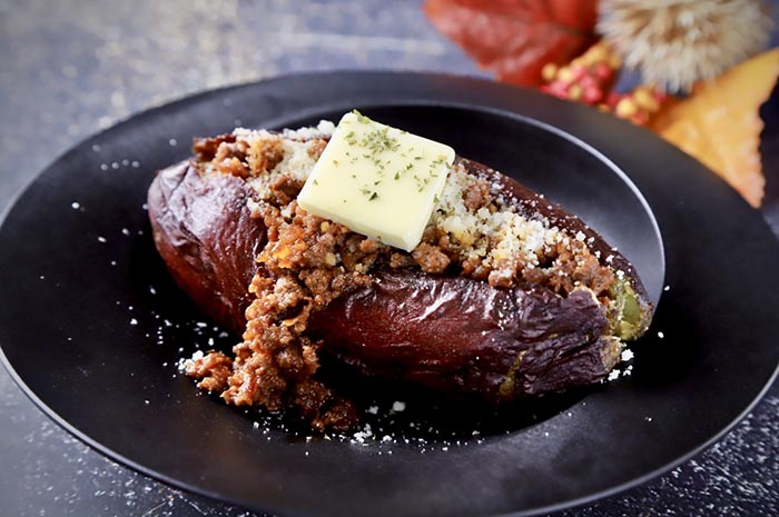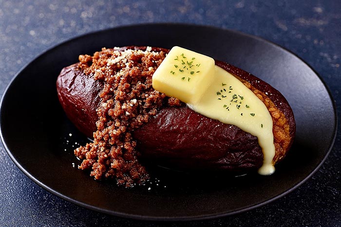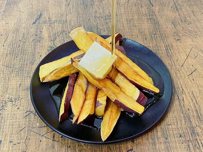 完熟のさつま芋に自家製チリとチーズ、ベーコンを。メープルシロップをかけて甘じょっぱさが最高においしい