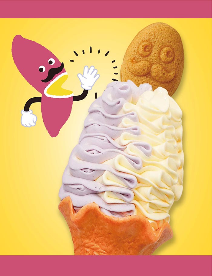 やきいもの妖精「焼き右衛門」型のおいもカステラがのった、安納芋×紫芋の華やか&濃厚なおいもソフト。