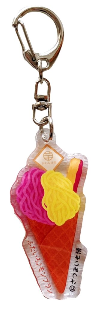 また、殿堂メニュー認定を記念しまして、「ふたいろ♪モンブラン」をモチーフにしたアクリルキーホルダーを会場で販売いたしました。「さつまいも博」会場での限定販売品となります。